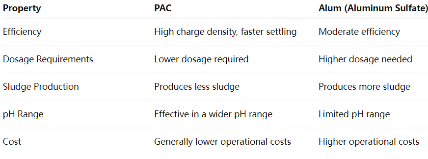 Toisin kuin perinteiset koagulantit, kuten alumni (alumiinisulfaatti), PAC tunnetaan erinomaisesta tehokkuudestaan ja nopeammasta laskeutumisajasta vedenkäsittelyprosesseissa. Sillä on korkea varaustiheys, joten se on erityisen tehokas suspendoituneiden hiukkasten destabilisoinnissa ja suurempien flokkien muodostamisessa, jotka voidaan sitten poistaa sedimentaatiolla tai suodatuksella.